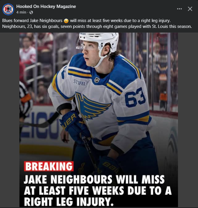 En effet, comme vous pouvez le voir, pour autant que vous maîtrisiez un minimum l’anglais, Jake Neigbours devra s’absenter pour une période d’au moins cinq semaines, à la suite d’une blessure à la jambe droite… Opinion : ce ne sera pas Alex Texier qui viendra combler ce vide. De manière plus réaliste, certains joueurs, tel que Buchnevich (2 buts, 4 aides en 9 matchs) devront élever leur jeu d’un cran et en donner (beaucoup) plus pour espérer avoir une chance de reproduire leurs succès de la dernière saison).